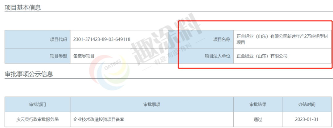 2023年1月31日,正金鋁業(yè)(山東)有限公司,新建年產(chǎn)2萬(wàn)噸鋁型材項(xiàng)目,在慶云縣行政審批服務(wù)局,進(jìn)行企業(yè)技術(shù)改造投資項(xiàng)目備案。