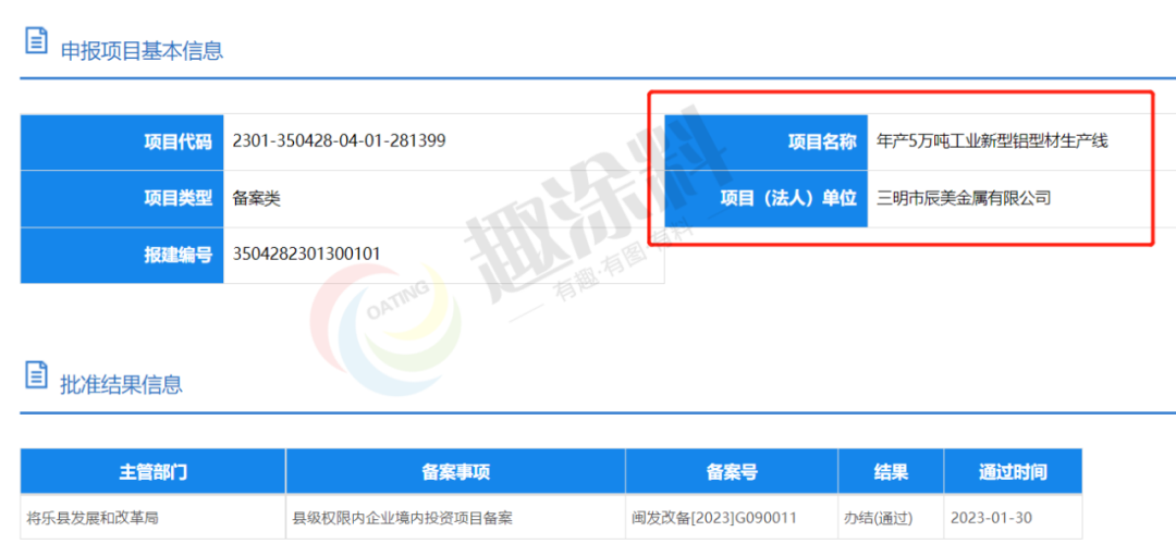 2023年1月30日,三明市辰美金屬有限公司,年產(chǎn)5萬(wàn)噸工業(yè)新型鋁型材生產(chǎn)線,在將樂(lè)縣發(fā)展和改革局,進(jìn)行縣級(jí)權(quán)限內(nèi)企業(yè)境內(nèi)投資項(xiàng)目備案。