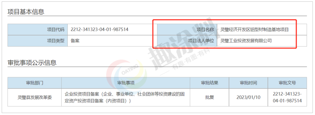 2023年1月10日,靈璧工業(yè)投資發(fā)展有限公司,靈璧經(jīng)濟(jì)開(kāi)發(fā)區(qū)鋁型材制造基地項(xiàng)目,在靈璧縣發(fā)展改革委,進(jìn)行企業(yè)投資項(xiàng)目備案(企業(yè)、事業(yè)單位、社會(huì)團(tuán)體等投資建設(shè)的固定資產(chǎn)投資項(xiàng)目備案(內(nèi)資項(xiàng)目))。