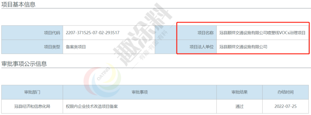 2022年6月13日,山東冠縣眾安交通工程有限公司,噴塑線VOCs治理項目,在冠縣經濟和信息化局,進行權限內企業(yè)技術改造項目備案。