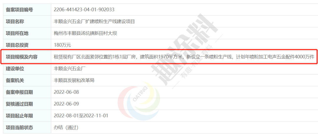 2022年6月9日,豐順金興五金廠,擴建噴粉生產線建設項目,在豐順縣發(fā)展和改革局,進行企業(yè)項目備案。