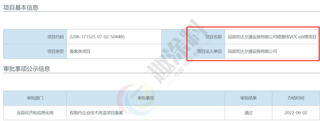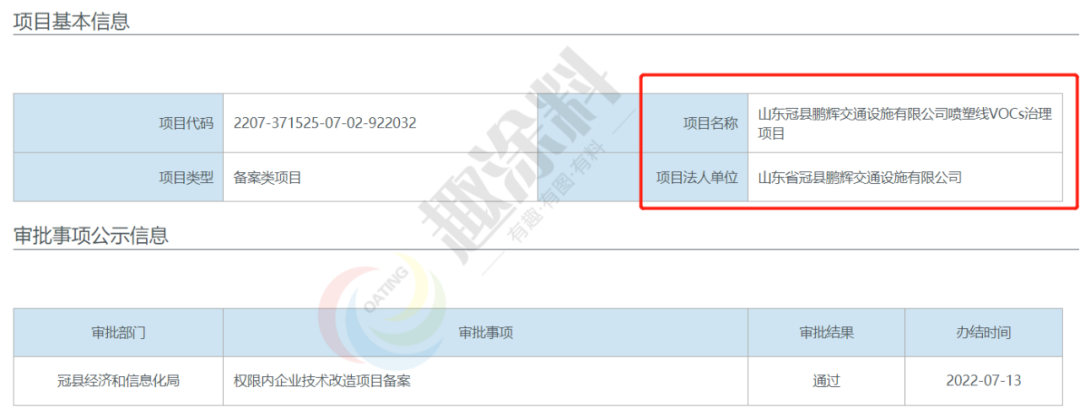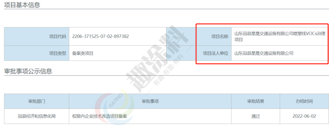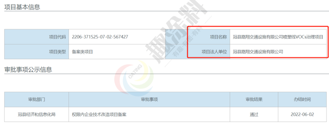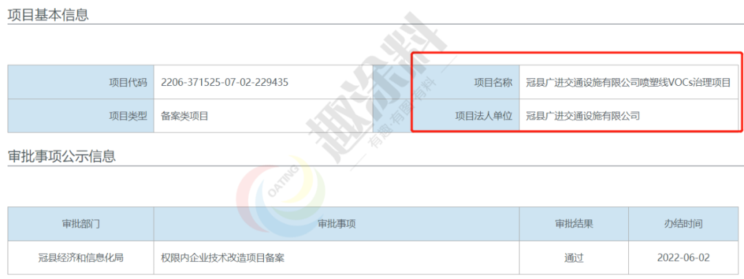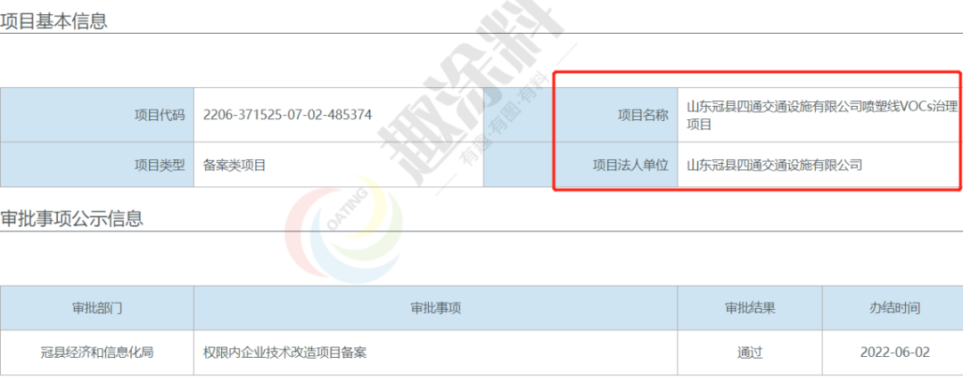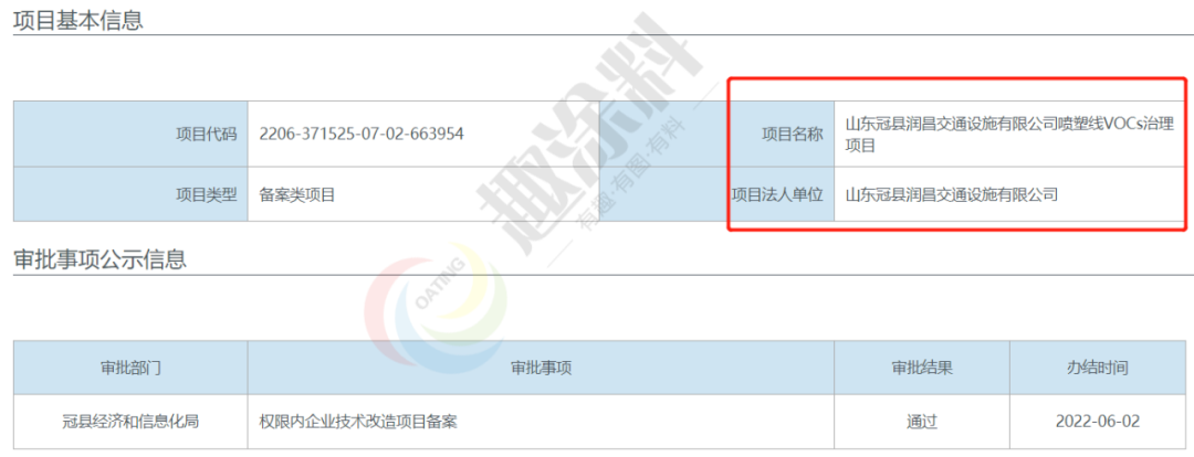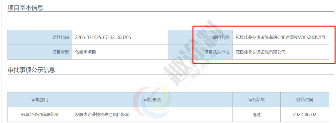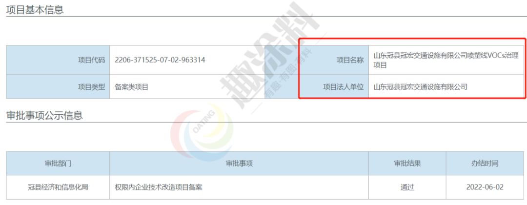 2022年6月2日,山東冠縣四通交通設施有限公司,噴塑線VOCs治理項目,在冠縣經濟和信息化局,進行權限內企業(yè)技術改造項目備案。