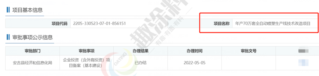 2022年5月7日,浙江安吉惠業(yè)家具有限公司,年產70萬套全自動噴塑生產線技術改造項目,在安吉縣經濟和信息化局,進行企業(yè)投資(含外商投資)項目備案(基本建設)。