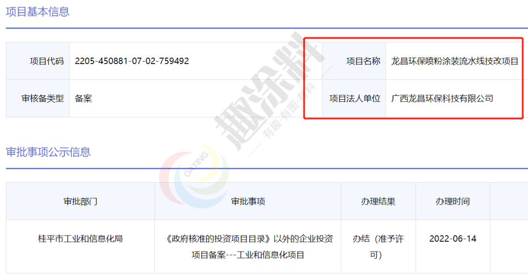 2022年6月14日,廣西龍昌環(huán)保科技有限公司,噴粉涂裝流水線技改項目,在桂平市工業(yè)和信息化局,進行企業(yè)投資項目備案。