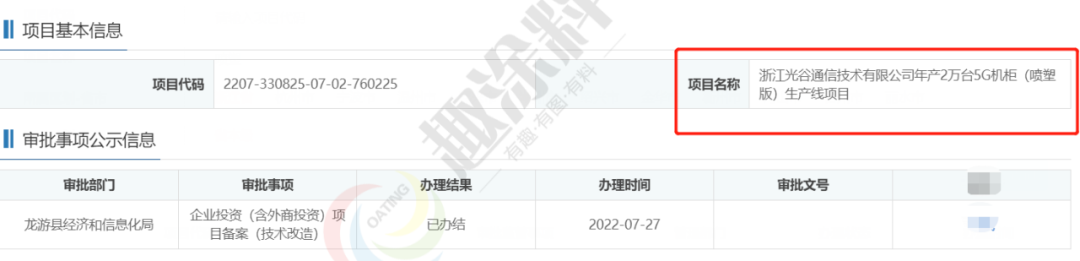 2022年7月27日,浙江光谷通信技術有限公司,年產2萬臺5G機柜(噴塑版)生產線項目,在龍游縣經濟和信息化局,進行企業(yè)投資(含外商投資)項目備案(技術改造)。