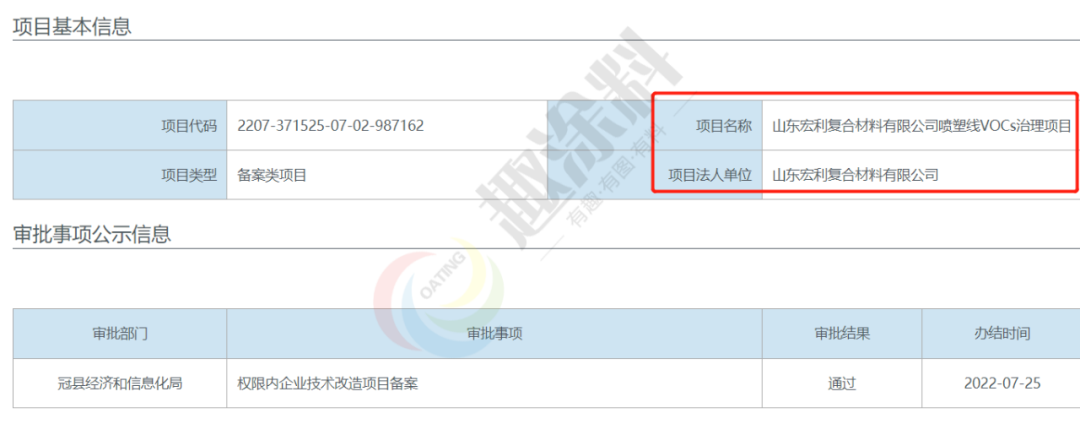 2022年7月25日,山東宏利復合材料有限公司,噴塑線VOCs治理項目,在冠縣經濟和信息化局,進行權限內企業(yè)技術改造項目備案。