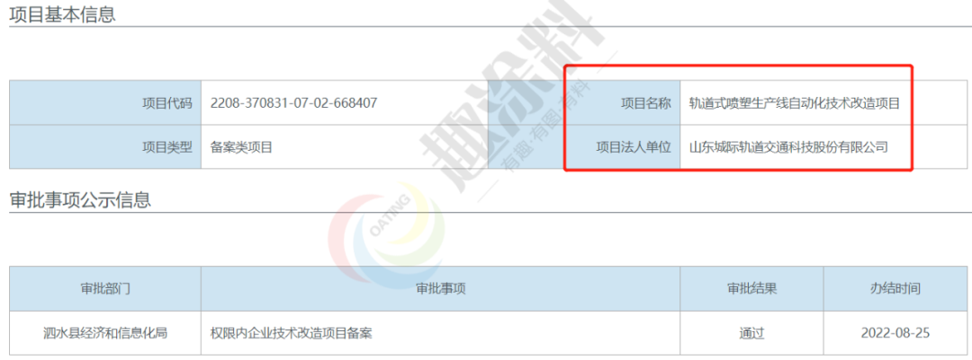 2022年8月25日,山東城際軌道交通科技股份有限公司,軌道式噴塑生產線自動化技術改造項目,在泗水縣經濟和信息化局,進行權限內企業(yè)技術改造項目備案。