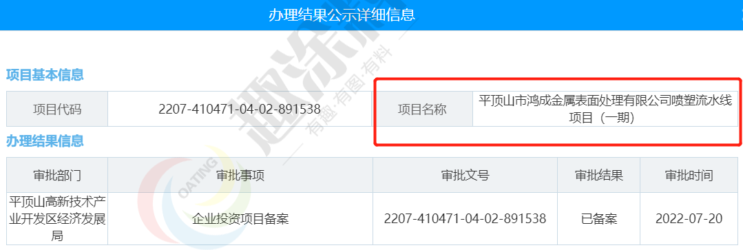 2022年7月20日,平頂山市鴻成金屬表面處理有限公司,噴塑流水線項目(一期),在平頂山高新技術產業(yè)開發(fā)區(qū)經濟發(fā)展局,進行企業(yè)投資項目備案。