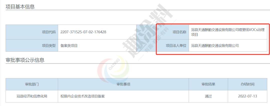 2022年7月13日,冠縣天道酬勤交通設施有限公司,噴塑線VOCs治理項目,在冠縣經濟和信息化局,進行權限內企業(yè)技術改造項目備案。