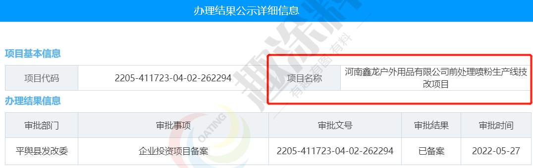 2022年5月27日,河南鑫龍戶外用品有限公司,前處理噴粉生產線技改項目,在平輿縣發(fā)改委,進行企業(yè)投資項目備案。