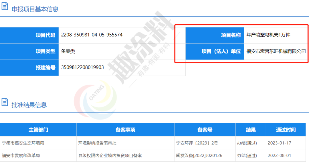 2022年8月1日,福安市宏譽東旺機械有限公司,年產噴塑電機殼1萬件,在福安市發(fā)展和改革局,進行縣級權限內企業(yè)境內投資項目備案。