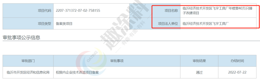 2022年7月22日,臨沂經濟技術開發(fā)區(qū)飛宇工具廠,年噴塑40萬只錘子改建項目,在臨沂市開發(fā)區(qū)經濟和信息化局,進行權限內企業(yè)技術改造項目備案。