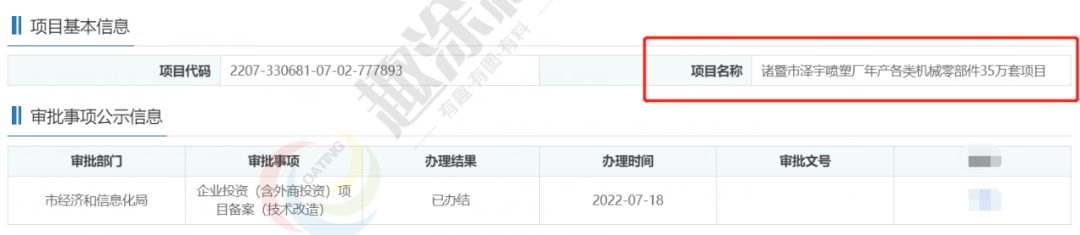 2022年7月18日,諸暨市澤宇噴塑廠,年產各類機械零部件35萬套項目,在市經濟和信息化局,進行企業(yè)投資(含外商投資)項目備案(技術改造)。