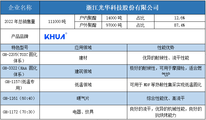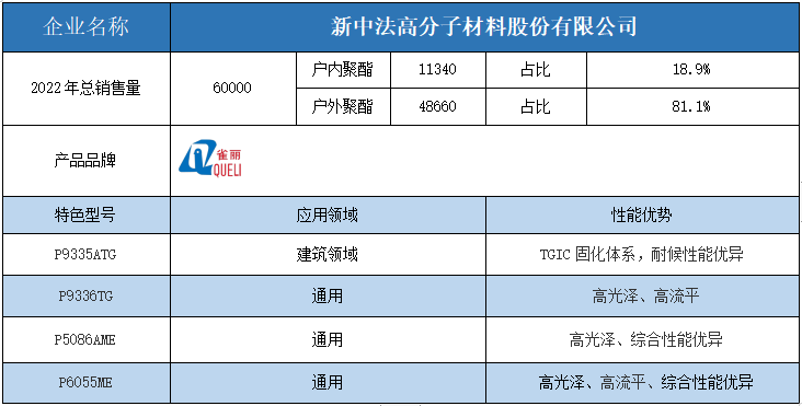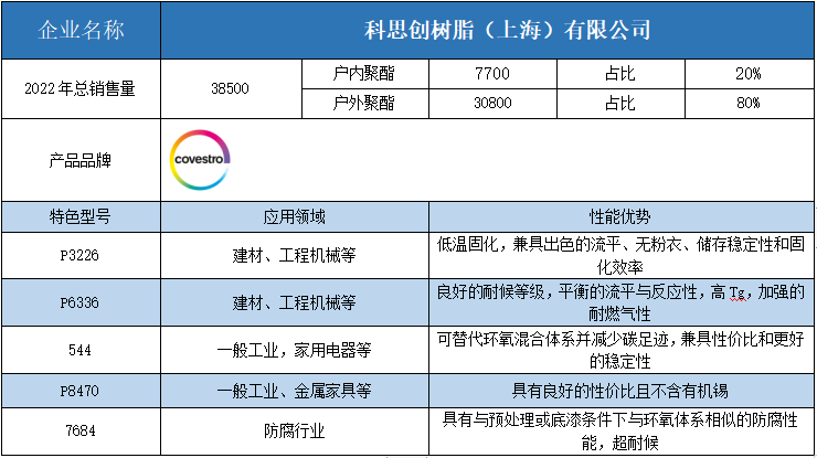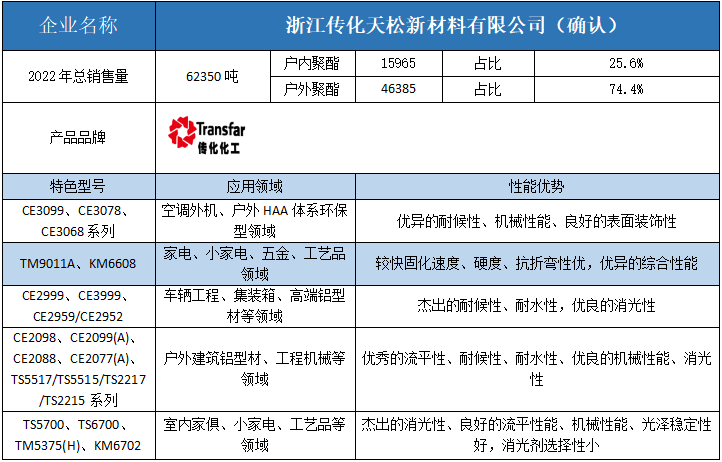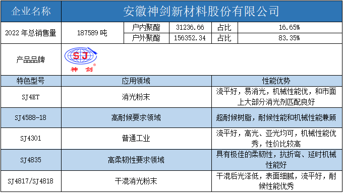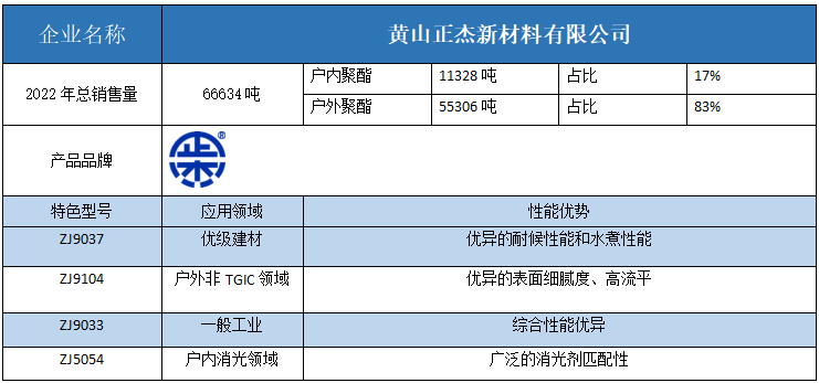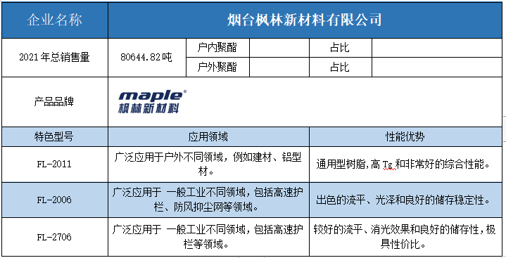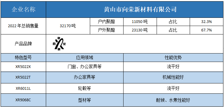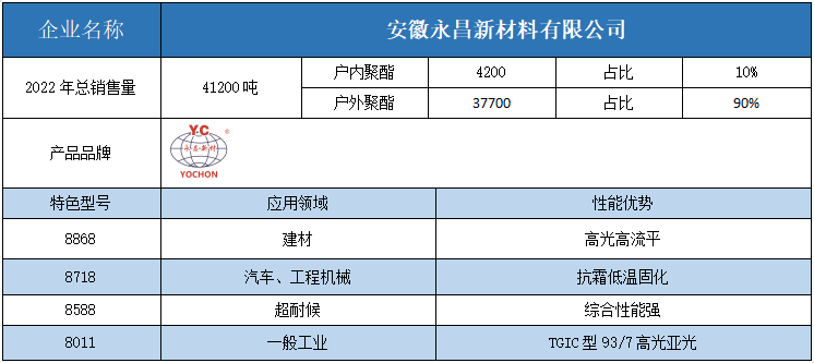 按照2022年粉末用聚酯樹脂銷售量依次排名,十強單位分別是安徽神劍新材料、浙江光華、擎天材料、煙臺楓林新材料、黃山正杰新材料、浙江傳化天松新材料、新中法高分子材料、安徽永昌新材料、科思創(chuàng)樹脂(上海)、黃山市向榮新材料。