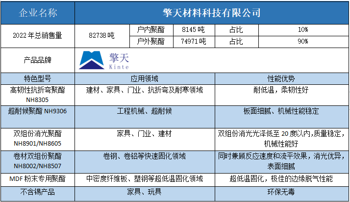 從銷售量上看,2022年粉末用聚酯樹脂銷售量在6萬噸及以上的企業(yè)共有6家。除了榜首安徽神劍新材料和榜眼浙江光華,第三名、第四名、第五名和第六名的擎天材料、煙臺楓林新材料、黃山正杰新材料、浙江傳化天松新材料也都在2022年取得了不錯的聚酯銷售成績,分別實現聚酯銷售量為8.27萬噸、8.06萬噸、6.67萬噸和6.24萬噸。