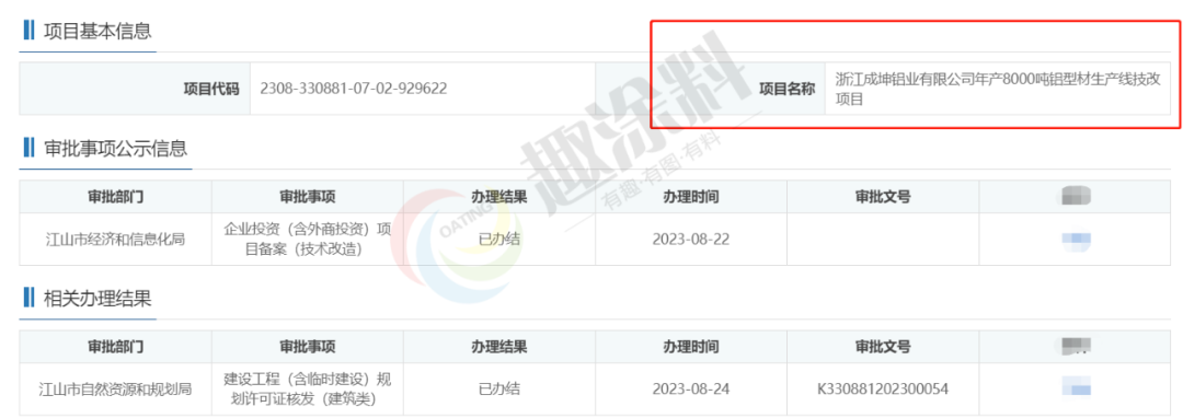 2023年8月22日,浙江成坤鋁業(yè)有限公司,年產(chǎn)8000噸鋁型材生產(chǎn)線技改項目,在江山市經(jīng)濟和信息化局,進行企業(yè)投資(含外商投資)項目備案(技術(shù)改造)。