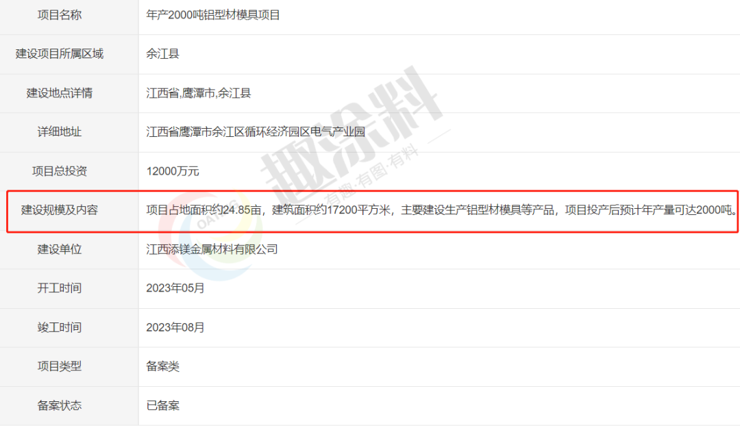 2023年8月18日,江西添鎂金屬材料有限公司,年產(chǎn)2000噸鋁型材模具項目,進行企業(yè)投資項目備案。
