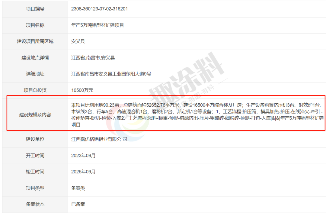 2023年8月17日,江西嘉優(yōu)格鋁鋁業(yè)有限公司,年產(chǎn)5萬噸鋁型材擴建項目,進行企業(yè)投資項目備案。