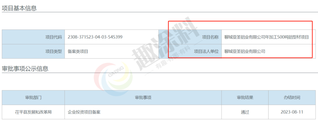 2023年8月11日,聊城亞圣鋁業(yè)有限公司,年加工500噸鋁型材項目,在茌平縣發(fā)展和改革局,進行企業(yè)投資項目備案。