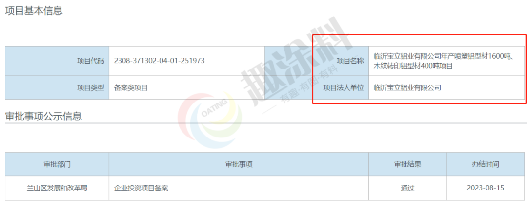 2023年8月11日,臨沂寶立鋁業(yè)有限公司,年產(chǎn)噴塑鋁型材1600噸、木紋轉(zhuǎn)印鋁型材400噸項目,在蘭山區(qū)發(fā)展和改革局,進行企業(yè)投資項目備案。