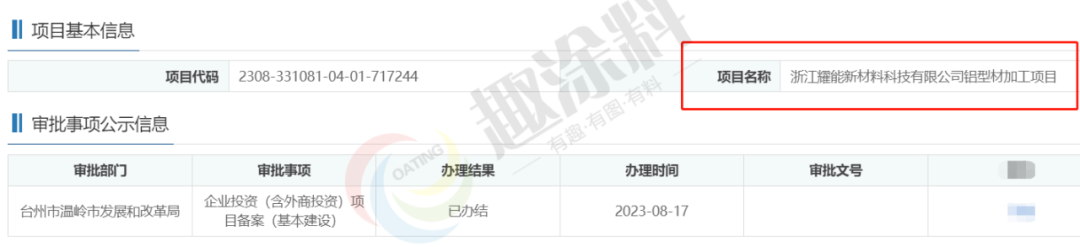 2023年8月17日,浙江耀能新材料科技有限公司,鋁型材加工項目,在臺州市溫嶺市發(fā)展和改革局,進行企業(yè)投資(含外商投資)項目備案(基本建設(shè))。
