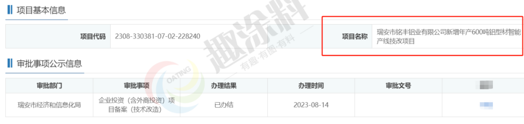 2023年8月14日,瑞安市銘豐鋁業(yè)有限公司,新增年產(chǎn)600噸鋁型材智能產(chǎn)線技改項目,在瑞安市經(jīng)濟和信息化局,進行企業(yè)投資(含外商投資)項目備案(技術(shù)改造)。