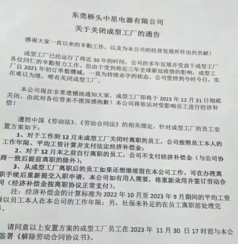 除此之外,位于東莞市橋頭鎮(zhèn)日資中星電器有限公司旗下成型工廠(chǎng)近期也宣布在年底徹底關(guān)閉。該公司發(fā)布通告稱(chēng),成型工廠(chǎng)已經(jīng)運(yùn)行了將近30年的時(shí)間,公司的多年發(fā)展亦受益于成型工廠(chǎng)各位同仁的辛勤努力工作。但由于受到將近三年全球新冠疫情的影響,成型工廠(chǎng)自2021年初訂單數(shù)驟減,一直為持續(xù)赤字的狀態(tài)。公司堅(jiān)持到今時(shí)今日,實(shí)在難以為繼,唯有關(guān)閉成型工廠(chǎng)。