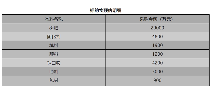1、粉末涂料原材料,年度預算金額:約45000萬元,具體采購內(nèi)容見需求表。