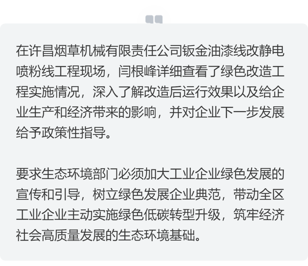 為深入了解轄區(qū)工業(yè)企業(yè)綠色化改造實(shí)施成效,科學(xué)指導(dǎo)下一步工業(yè)污染治理工作,12月14日上午,河南省許昌市城鄉(xiāng)一體化示范區(qū)管委會(huì)副主任閆根峰帶領(lǐng)中原電氣谷發(fā)展服務(wù)中心、生態(tài)環(huán)境分局相關(guān)負(fù)責(zé)同志對(duì)許昌煙草機(jī)械有限責(zé)任公司綠色化改造工程進(jìn)行了實(shí)地調(diào)研。
