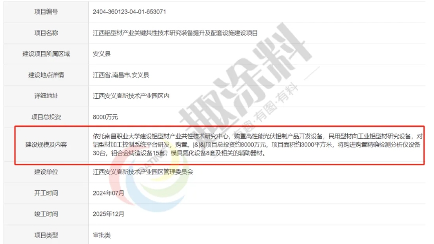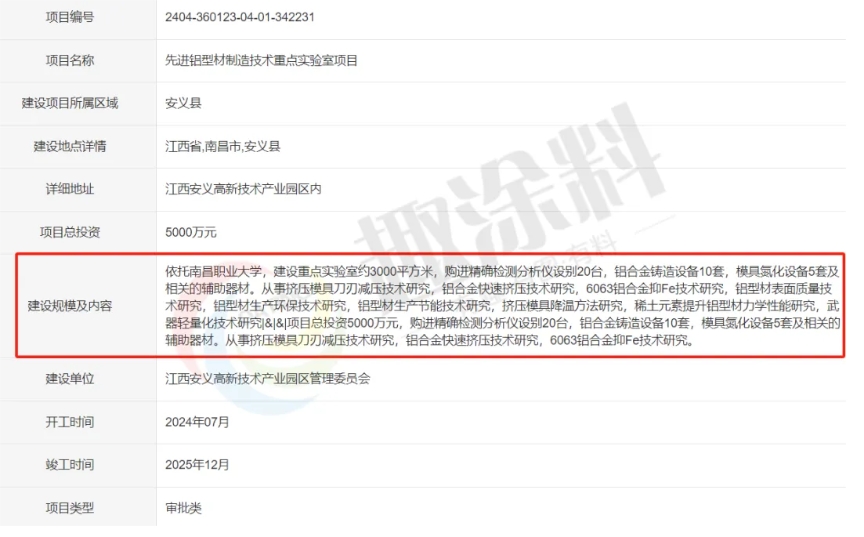 2024年4月,江西安義高新技術(shù)產(chǎn)業(yè)園區(qū)管理委員會,江西鋁型材產(chǎn)業(yè)關(guān)鍵共性技術(shù)研究裝備提升及配套設(shè)施建設(shè)項目,進行審批。
