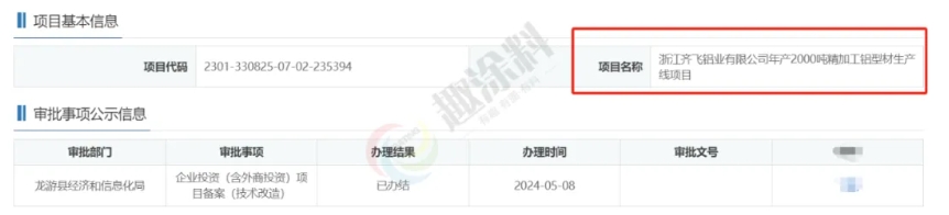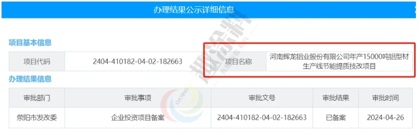 2024年4月26日,河南輝龍鋁業(yè)股份有限公司,年產(chǎn)15000噸鋁型材生產(chǎn)線節(jié)能提質(zhì)技改項目,在滎陽市發(fā)改委,進行企業(yè)投資項目備案。