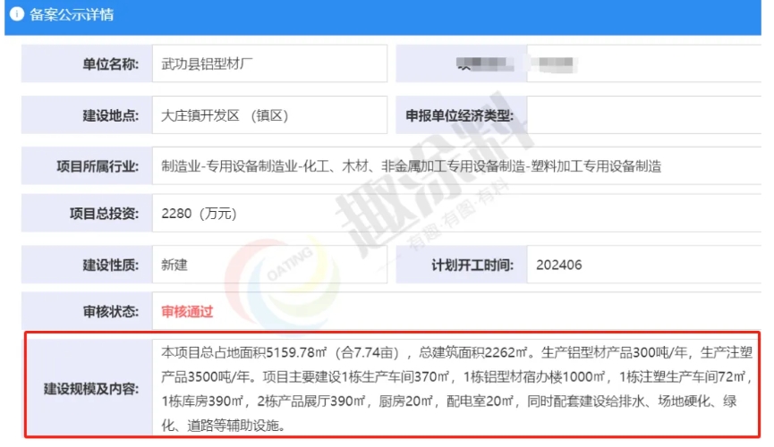2024年6月12日,武功縣鋁型材廠,鋁型材加工及注塑生產(chǎn)項目,進行企業(yè)投資項目備案。