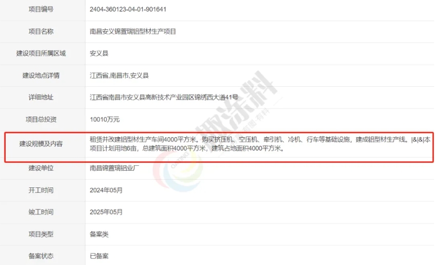2024年4月26日,南昌錦萱瑞鋁業(yè)廠,鋁型材生產(chǎn)項目,進行企業(yè)項目備案。