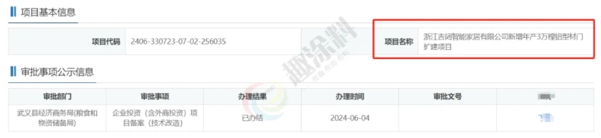 2024年6月4日,浙江吉闥智能家居有限公司,新增年產(chǎn)3萬樘鋁型材門擴建項目,在武義縣經(jīng)濟商務(wù)局(糧食和物資儲備局),進行企業(yè)投資(含外商投資)項目備案(技術(shù)改造)。