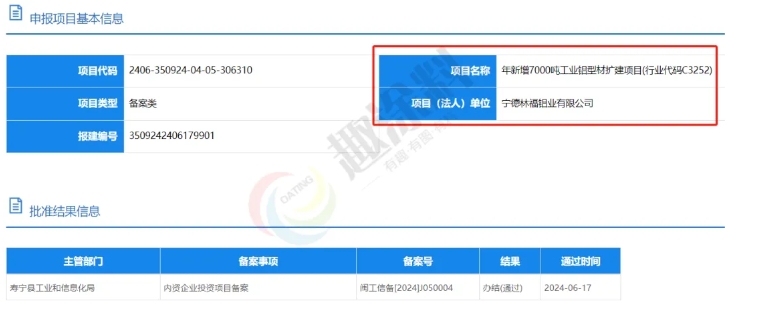 2024年6月17日,寧德林福鋁業(yè)有限公司,年新增7000噸工業(yè)鋁型材擴建項目,在壽寧縣工業(yè)和信息化局,進行內(nèi)資企業(yè)投資項目備案。
