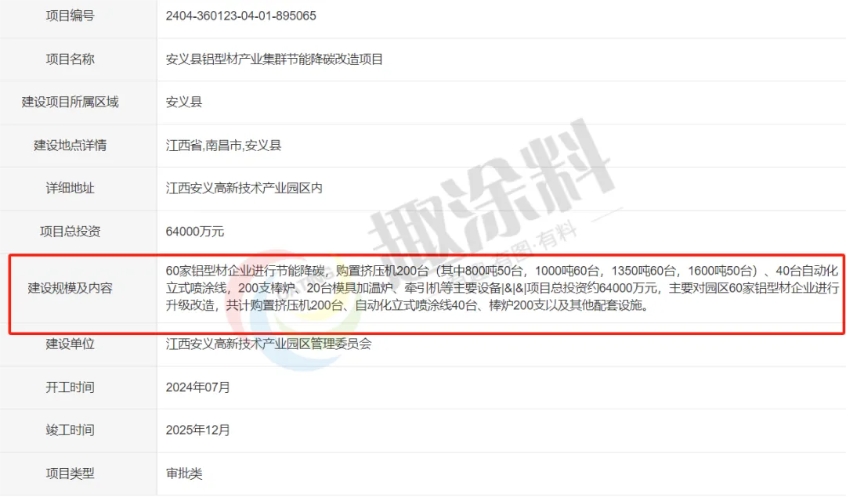 2024年4月,江西安義高新技術(shù)產(chǎn)業(yè)園區(qū)管理委員會,安義縣鋁型材產(chǎn)業(yè)集群節(jié)能降碳改造項目,進行審批。