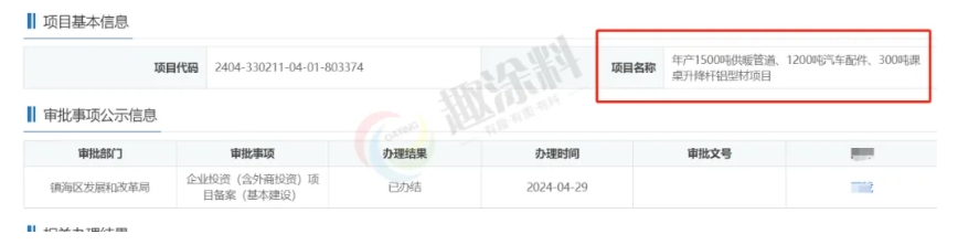 2024年4月29日,寧波祥邦新材料有限公司,年產(chǎn)1500噸供暖管道、1200噸汽車配件、300噸課桌升降桿鋁型材項目,在鎮(zhèn)海區(qū)發(fā)展和改革局,進行企業(yè)投資(含外商投資)項目備案(基本建設(shè))。