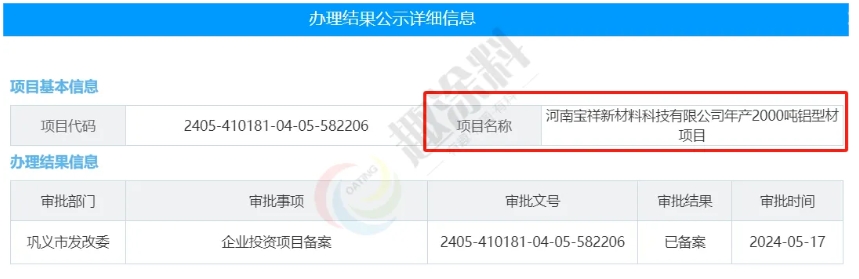 2024年5月17日,河南寶祥新材料科技有限公司,年產(chǎn)2000噸鋁型材項目,在鞏義市發(fā)改委,進行企業(yè)投資項目備案。