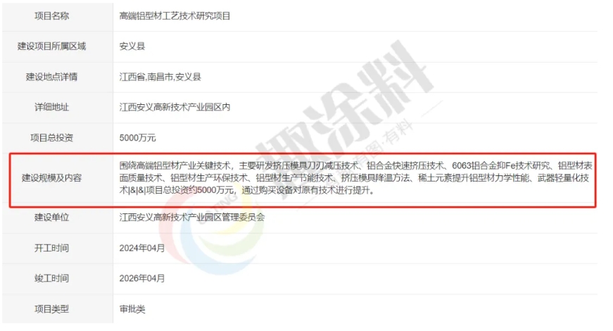 2024年4月,江西安義高新技術(shù)產(chǎn)業(yè)園區(qū)管理委員會,高端鋁型材工藝技術(shù)研究項目,進行審批。