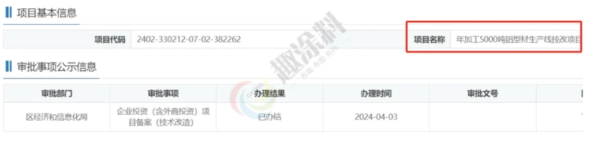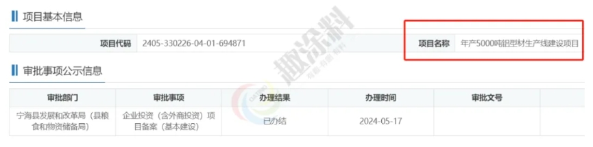 2024年4月3日,寧波市銀鑫合金材料科技有限公司,年加工5000噸鋁型材生產(chǎn)線技改項目,在區(qū)經(jīng)濟和信息化局,進行企業(yè)投資(含外商投資)項目備案(技術(shù)改造)。