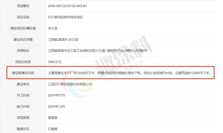 2024年6月27日,江西巴爾蒂克家居科技有限公司,鋁型材技改項目,進行企業(yè)項目備案。