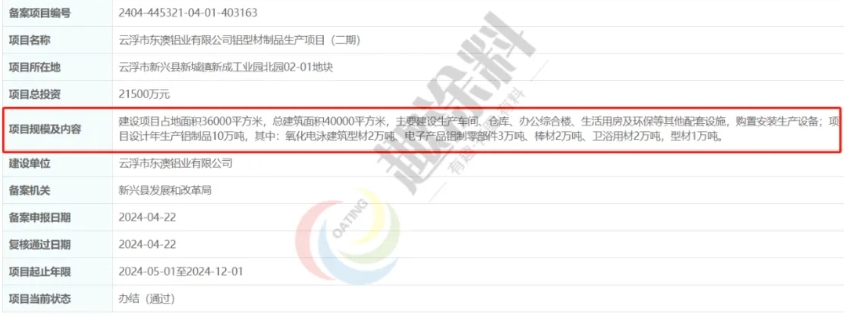 2024年4月22日,云浮市東澳鋁業(yè)有限公司,鋁型材制品生產(chǎn)項目(二期),在新興縣發(fā)展和改革局,進行企業(yè)投資項目備案。