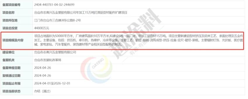 2024年4月26日,臺山市志高興五金塑膠有限公司,年加工15萬噸燈具鋁型材配件擴建項目,在臺山市發(fā)展和改革局,進行企業(yè)投資項目備案。