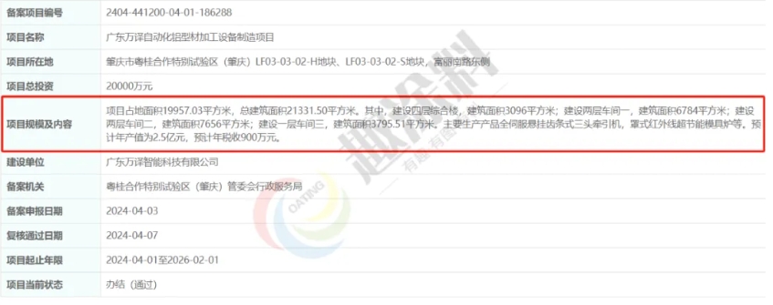 2024年4月7日,廣東萬譯智能科技有限公司,自動化鋁型材加工設(shè)備制造項目,在粵桂合作特別試驗區(qū)(肇慶)管委會行政服務(wù)局,進行企業(yè)項目備案。