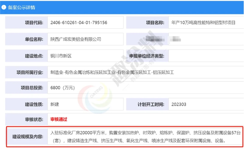 2024年6月18日,陜西廣成宏美鋁業(yè)有限公司,年產(chǎn)10萬噸高性能特種鋁型材項目,進行企業(yè)投資項目備案。