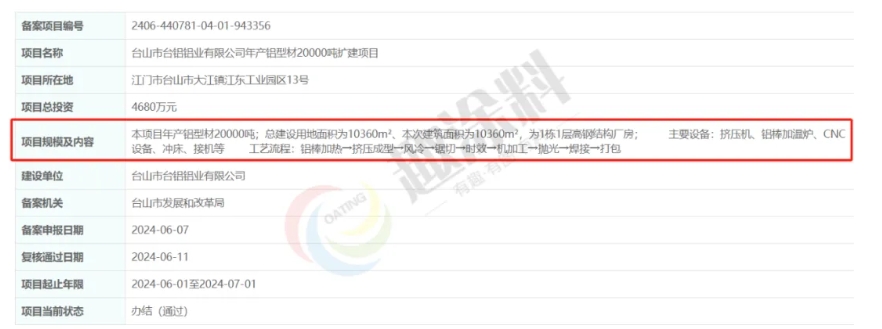 2024年6月7日,臺山市臺鋁鋁業(yè)有限公司,年產(chǎn)鋁型材20000噸擴建項目,在臺山市發(fā)展和改革局,進行企業(yè)投資項目備案。