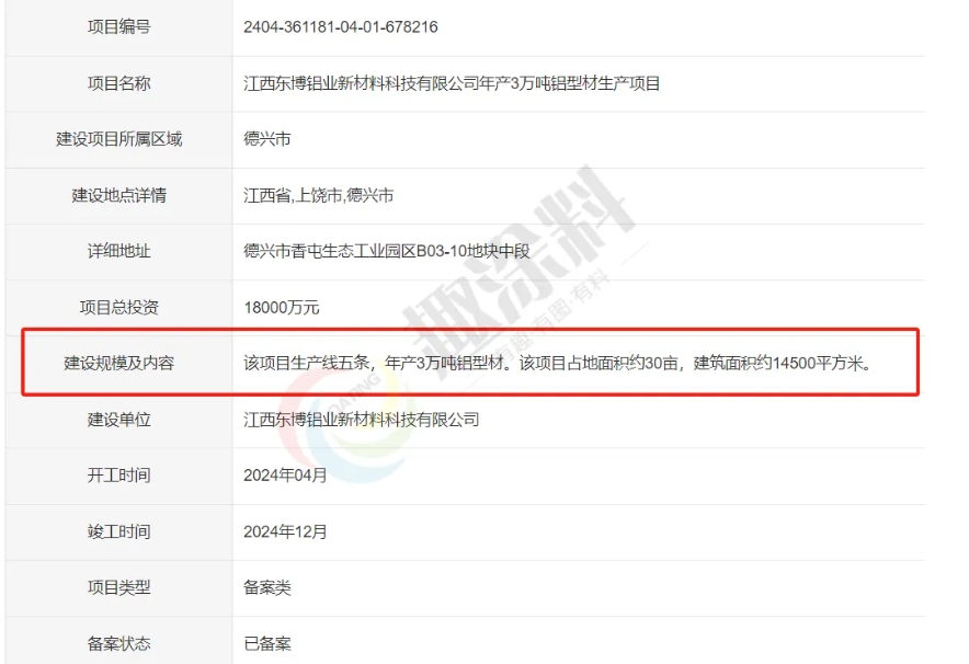 2024年6月26日,江西東博鋁業(yè)新材料科技有限公司,年產(chǎn)3萬噸鋁型材生產(chǎn)項目,進行企業(yè)項目備案。