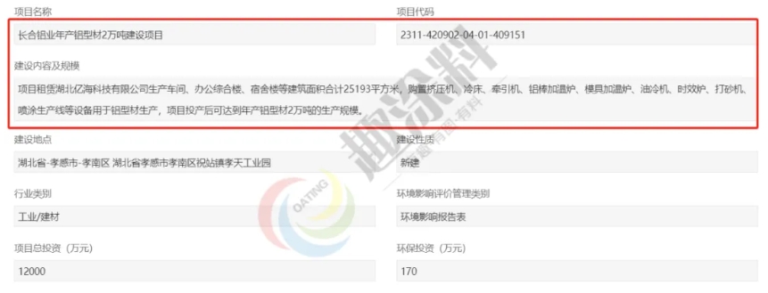 2024年4月3日,湖北省長合鋁業(yè)科技有限公司,年產(chǎn)鋁型材2萬噸建設(shè)項目,在孝感市孝南區(qū)環(huán)境保護局受理。