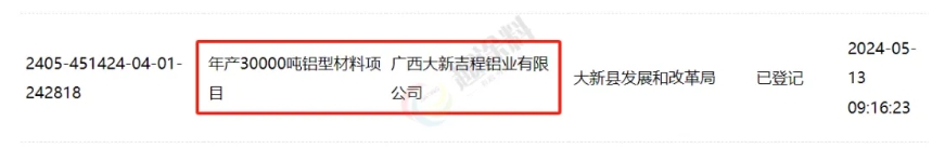 2024年4月3日,曲靖偉創(chuàng)鋁業(yè)有限公司,年產(chǎn)5萬噸鋁型材技改項目,在沾益區(qū)發(fā)展改革局,進行企業(yè)投資項目備案。