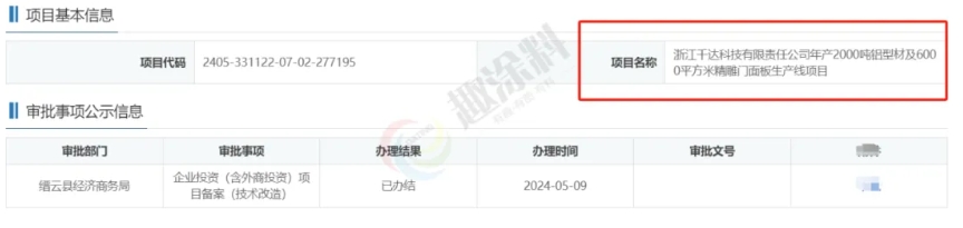 2024年6月4日,江陰市旺發(fā)科技有限公司,鋁型材技改擴能項目,在江陰市新橋鎮(zhèn)人民政府,進行企業(yè)投資項目備案。